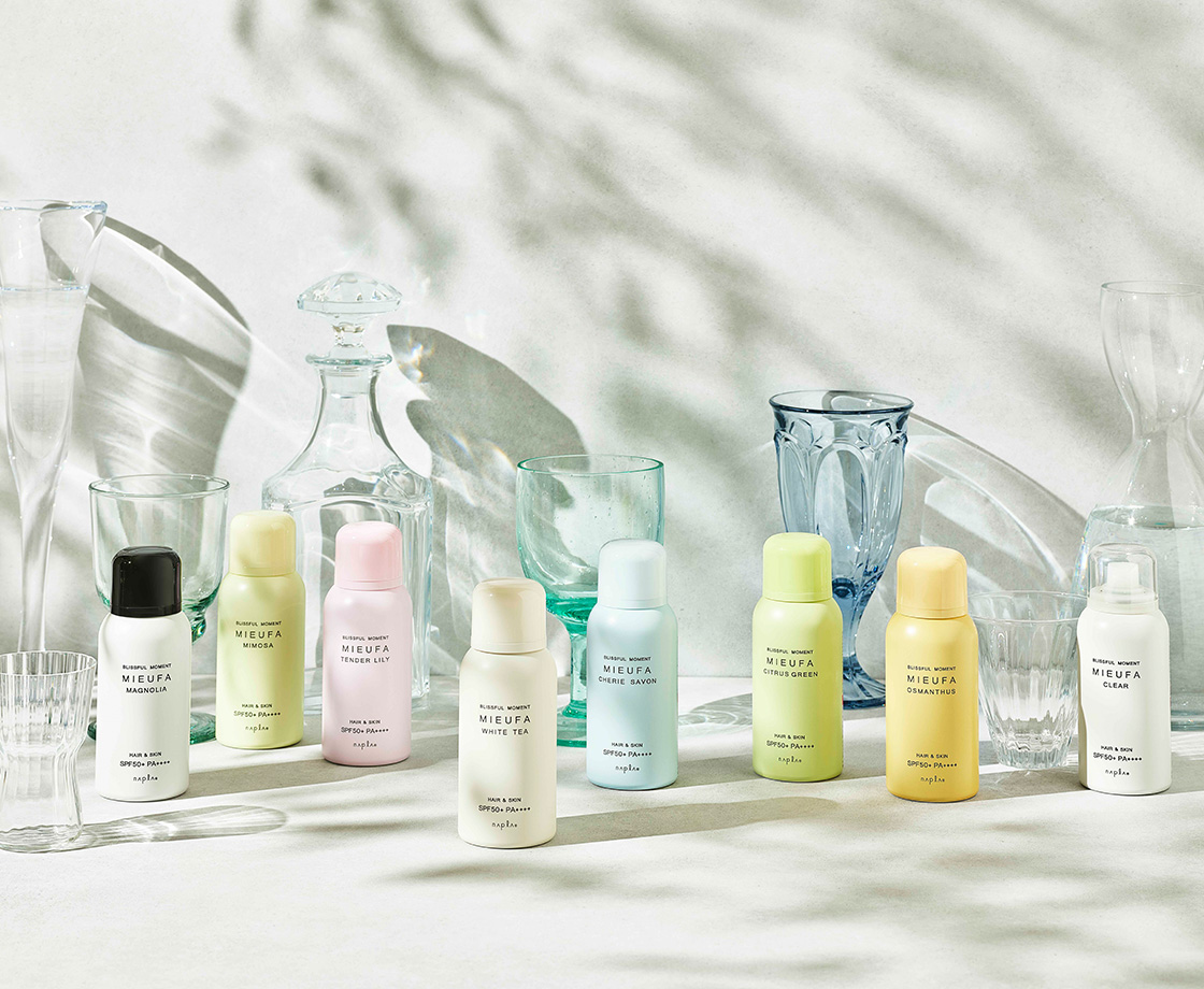 香りとケアにこだわったUVケアスプレー「MIEUFA」。7種類の香りと、無香料の全8種類からお選びいただけます。SPF50+ / PA++++で紫外線から髪と肌をしっかり守ります。 ¥1320(税込)